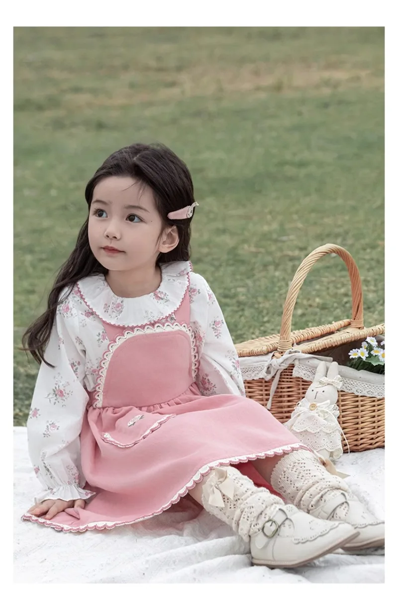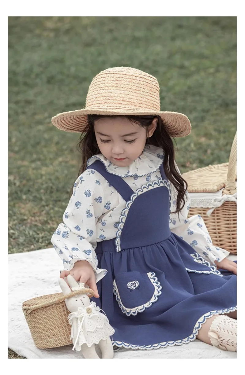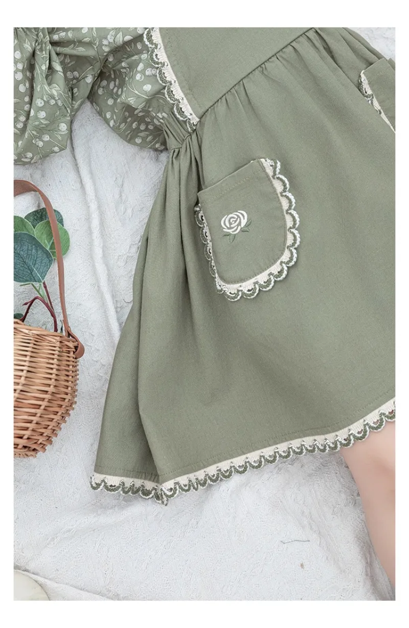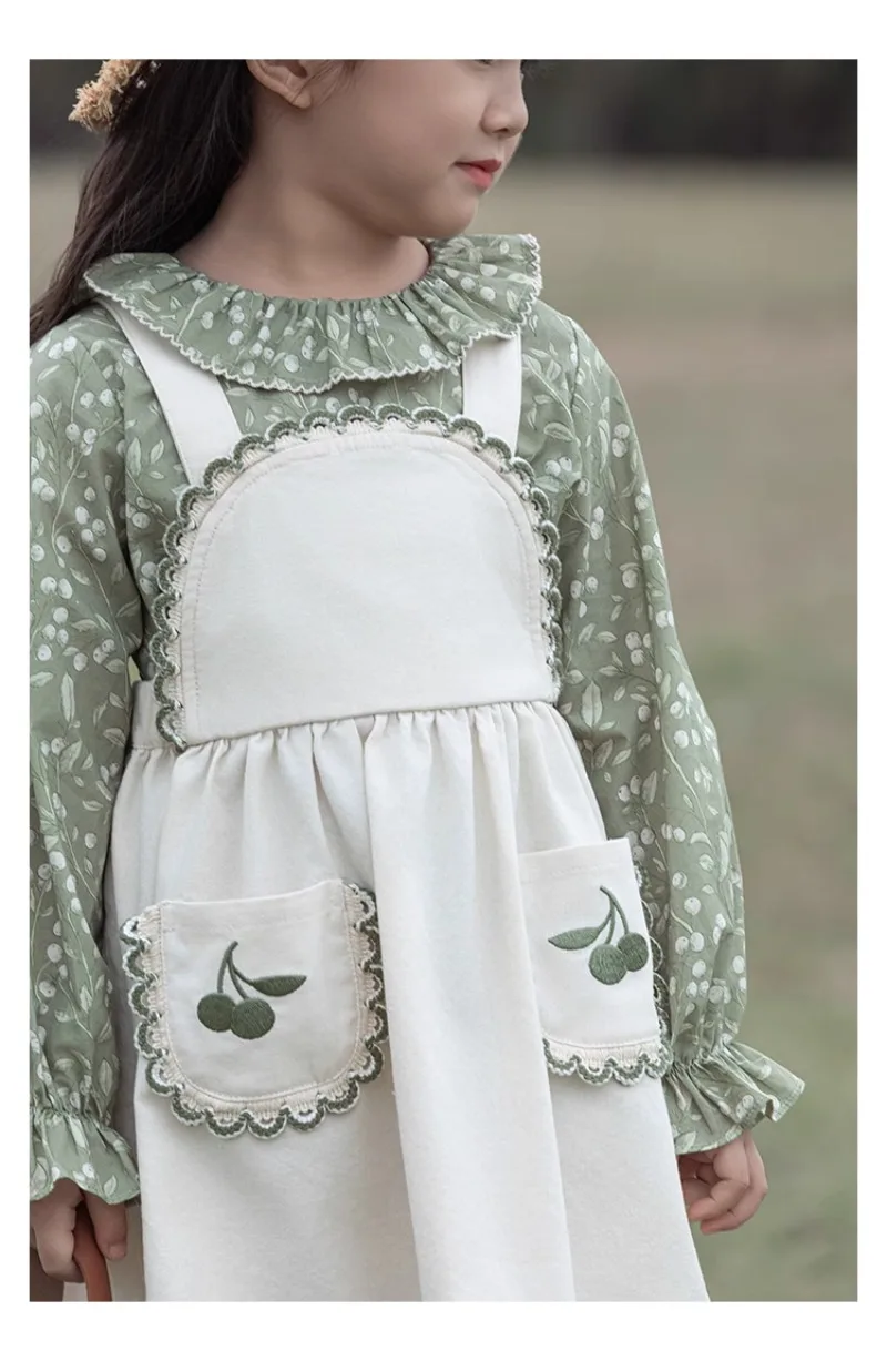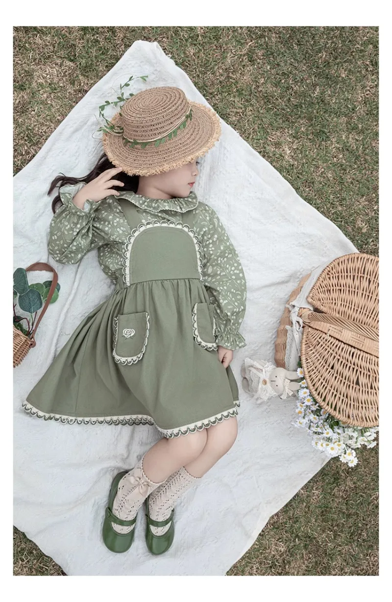 INS Fashion Girl Sundress New Embroidered Pocket Girl White Dress Green Shirt Set Casual Forest Children's Clothing