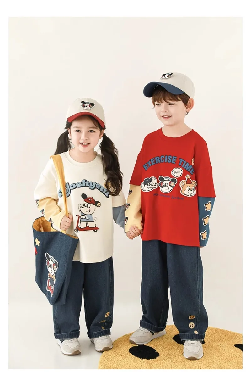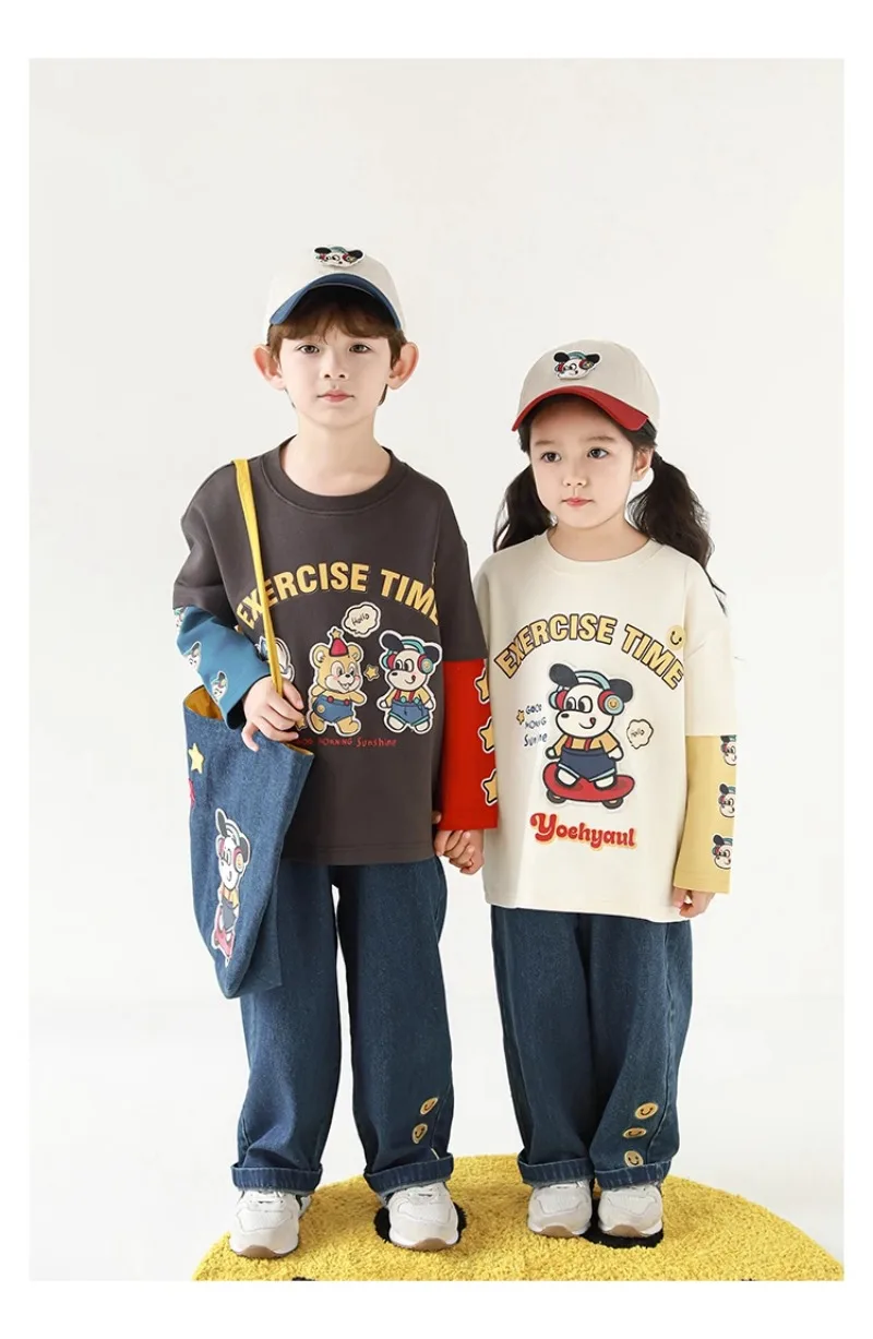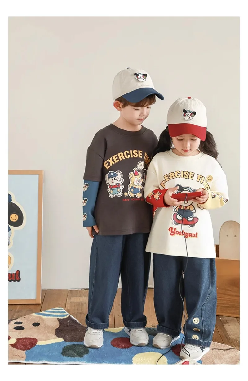 INS Children's Fake Two Piece T-shirt Fashion Street Boys Tees Short Sleeve Cartoon Print Girls' T-shirt New Kids Clothes