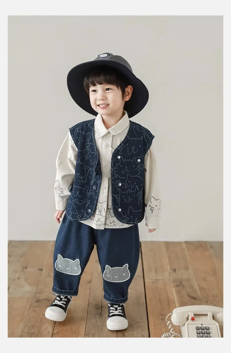 Baby Boy Clothes Denim Series Fashion Graffiti Kitten Print Boy Jacket Jeans Set Children's Vest Coat Korean Kids Clothes