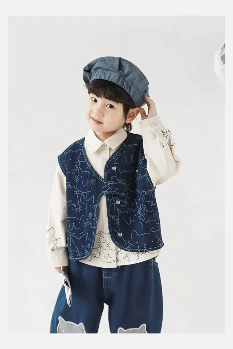 Baby Boy Clothes Denim Series Fashion Graffiti Kitten Print Boy Jacket Jeans Set Children's Vest Coat Korean Kids Clothes 2025