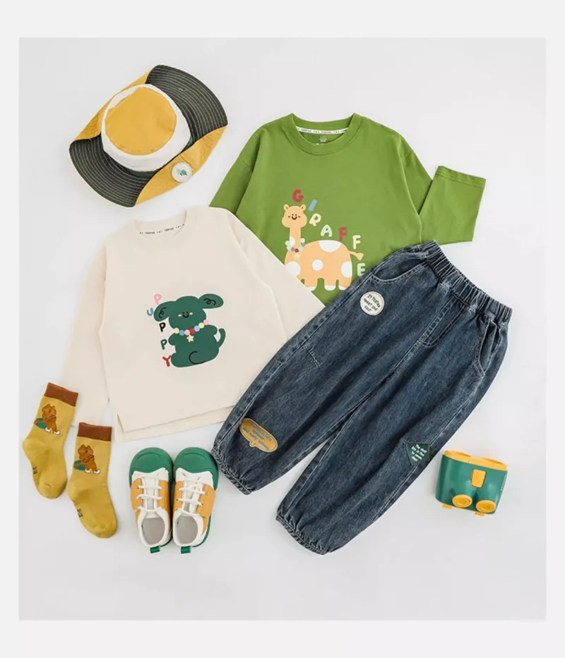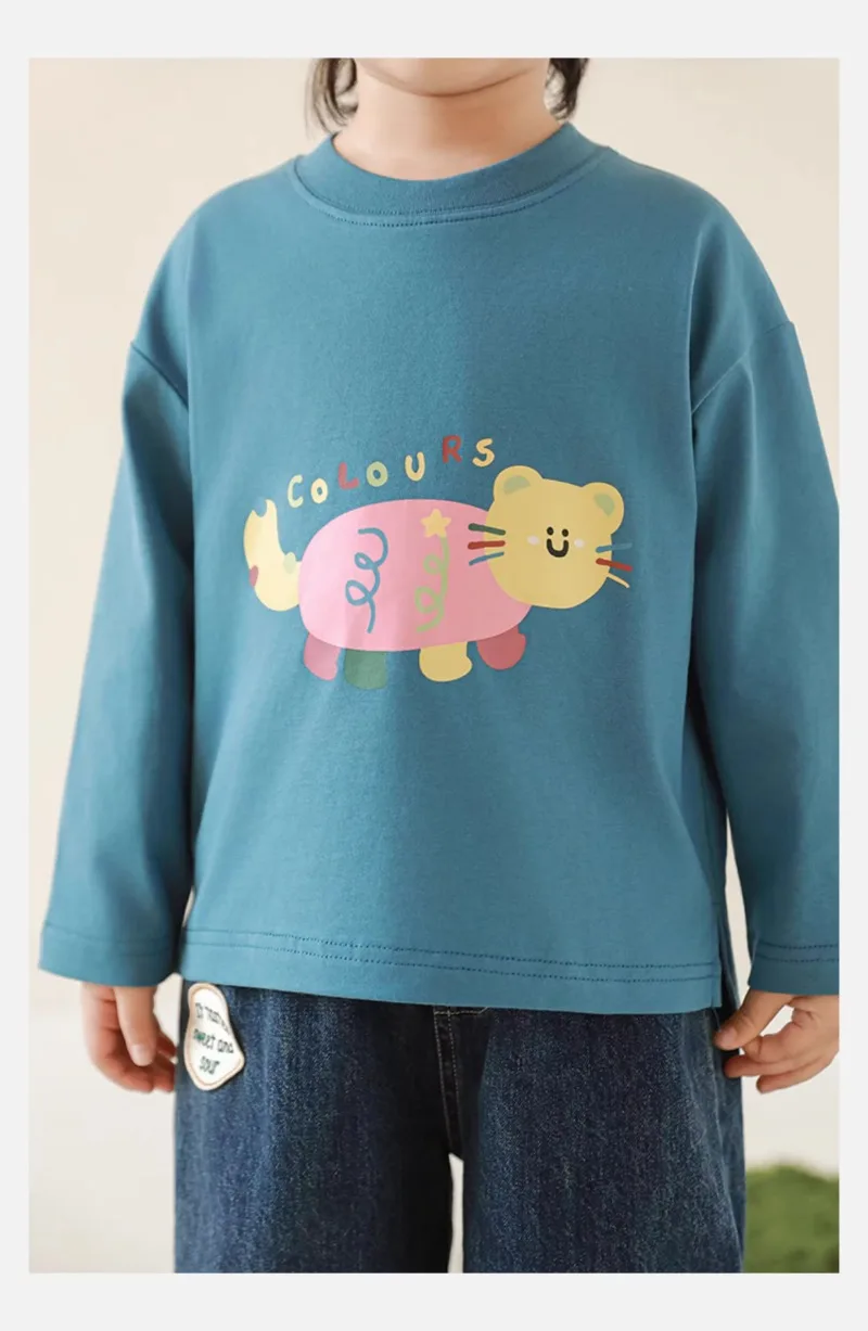 New Fashion Children's Set Cartoon Cat Print Baby Girl T-shirt Boy Jeans 100% Cotton Children's Top Clothing